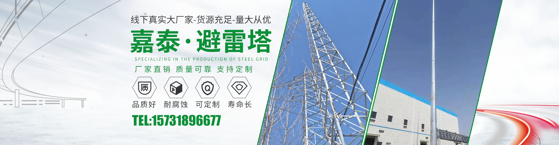衡水嘉泰鋼結構有限公司位于鐵塔制造之鄉(xiāng)-衡水市景縣廣川經濟開發(fā)區(qū),石德、京九鐵路交匯處,距北京、天津、石家莊、濟南均在2小 時交通圈內,交通便利。公司主要產品有:避雷塔、監(jiān)控塔、瞭望塔、消防訓練塔、電力架構、樓頂工藝塔、廣播電視塔、煙囪塔、測風塔 、電力塔、單管塔、雷達塔、仿生樹塔、氣象觀測塔、路燈桿,一體化基站、ETC龍門架等,是一家集設計,生產,運輸,安裝,維護為一體的廠家。主要服務于鐵塔公司、通信三大運營商、國防通訊,鐵路及森 ......